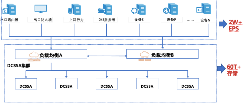 集群内置负载接收到各设备的日志数据后,负载的保活keep alive策略会将数据分发至集群内DCSSA设备,当集群内某一DCSSA设备出现故障或其他原因无法处理数据,负载均衡轮询策略会将日志数据分发至集群内其余DCSSA,且各DCSSA接收数据差异不大。采用“日志产品集群部署+采集负载均衡HA”部署方案可应对出口日志量高达10W EPS级别的高可用场景。